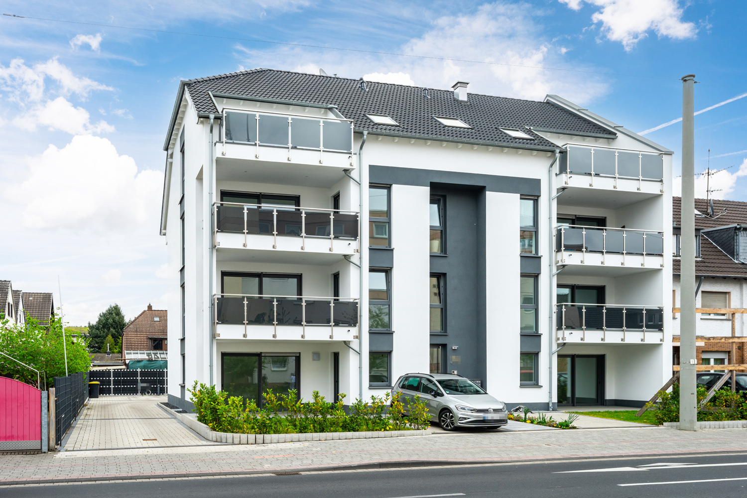 Das Grundstück befindet sich im Ortskern von Troisdorf und umfasst 679 m² Baugrundstück. Insgesamt acht Wohnungen von 70 m² bis 90 m². Jede Wohnung ist mit einem Balkon oder einer Terrasse in Süd-West Ausrichtung ausgestattet.